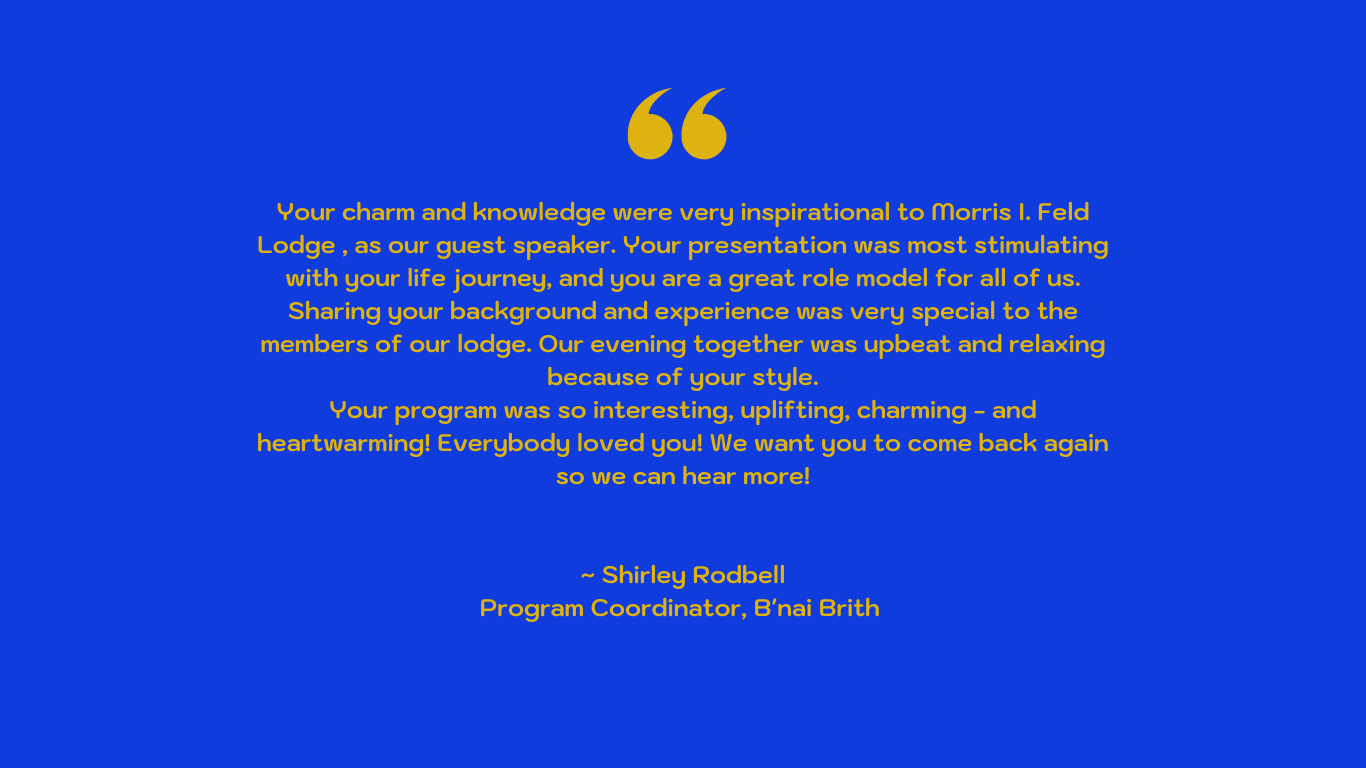 Thank you again for being such a lovely Guest Speaker at the luncheon of the Senior Sisterhood of the Bnai Jacob Shaarei Zion Sisterhood today.