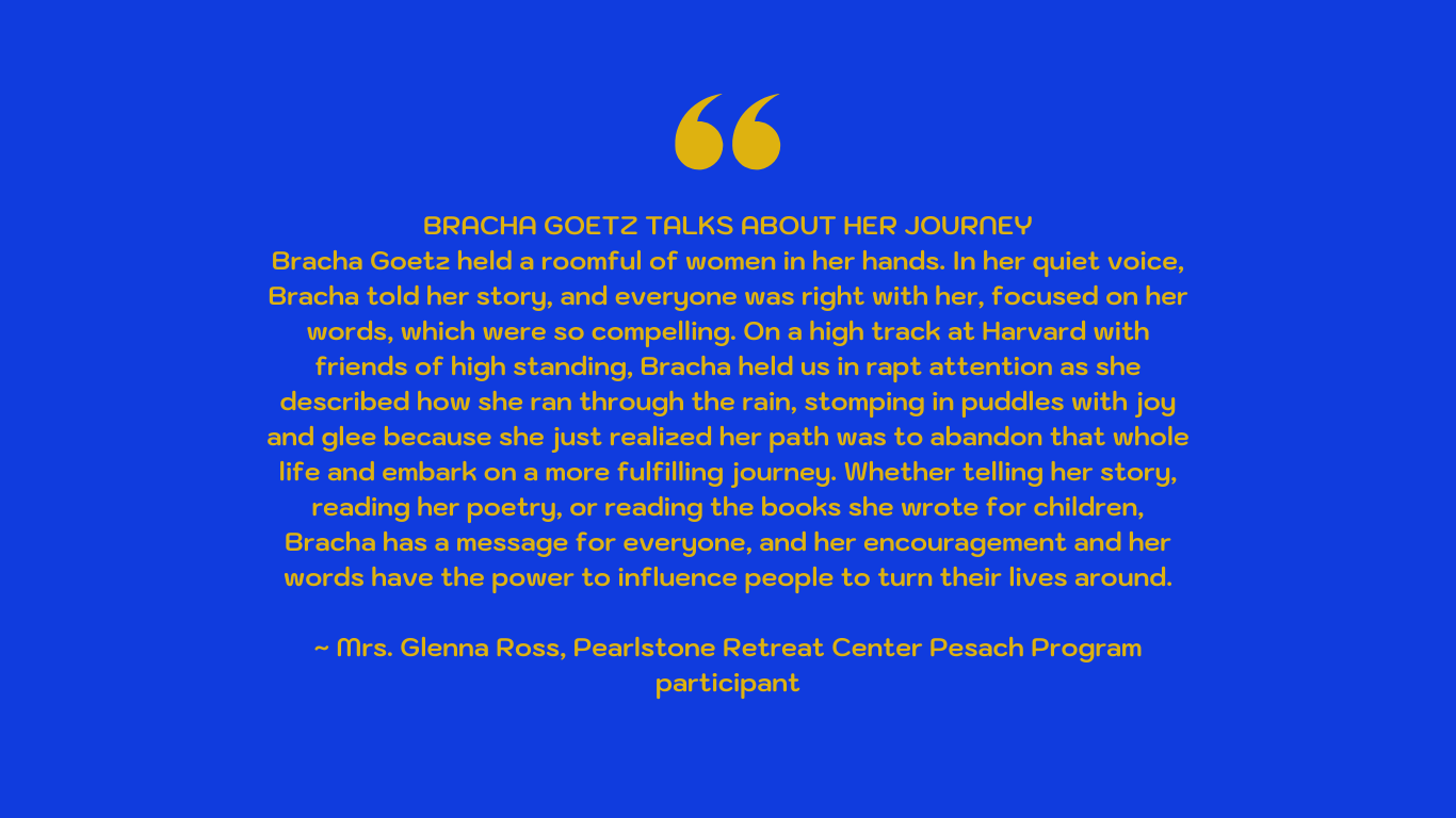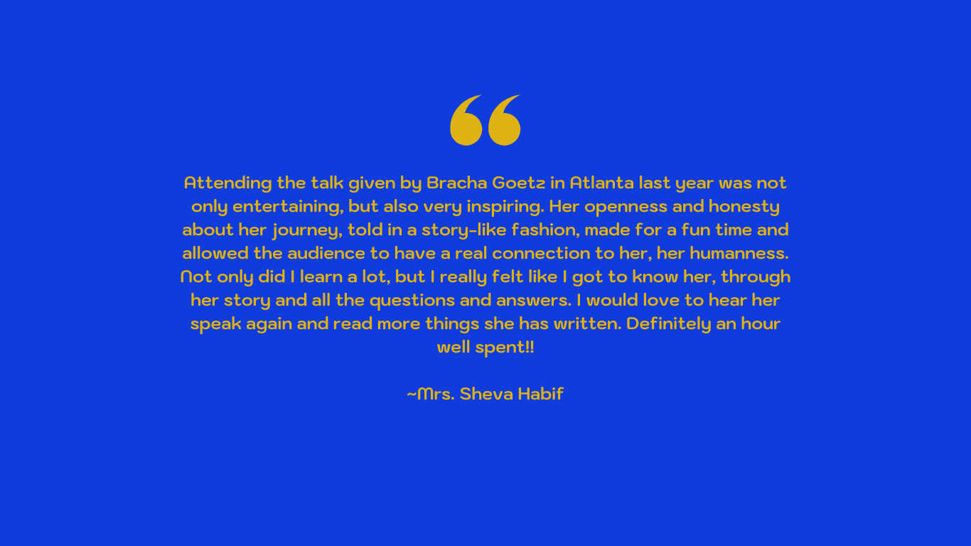 Bracha Goetz was an amazingly popular speaker at our seminary. She kept the girls completely engaged for an hour presentation, and then the students begged her to stay so they could ask her follow-up questions. Many of the students were so inspired and moved by her story that they had tears in their eyes. She was the most popular guest speaker we had all year!!!