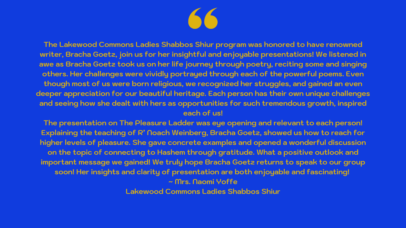Her name alone drew an unprecedented crowd of women on a short, very cold Shabbos. And it was well worth it! Bracha's presentation was heartwarming and sincere, creative and inspirational. Everyone who attended walked away with an uplifted feeling and the chizuk to try and reach out to others who might be going through the same spiritual tribulations that Bracha experienced.